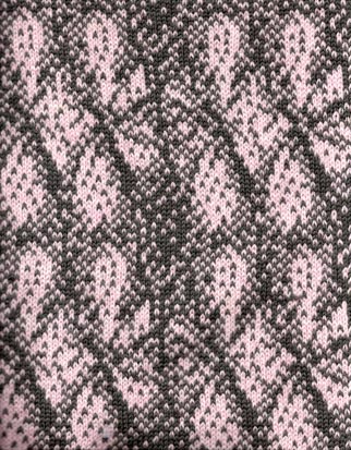 Seastrands design mirror-imaged The strands remind me of seaweed strands like those you often find on the beach near where I live. This design can be used on the diagonal to bring movement into your item or garment, or mirror imaged to create a chevron effect. DIfferent effects can be obtained by mirror-imaging at different places on the design. Electronic owners can do this effortlessly by flicking a switch on the patterning controls. However, don't be put off if you only have a 24st or 40 st punchcard machine. You can still achieve this look by knitting the fabric in two halves. No need to repunch your card, you just put it in back to front for the second section. |