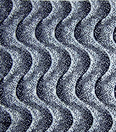 Seastrands design mirror-imaged )from Contemporary Pattern hand or machine knit.) The strands remind me of seaweed strands like those you often find on the beach near where I live. This design can be used on the diagonal to bring movement into your item or garment, or mirror imaged to create a chevron effect. DIfferent effects can be obtained by mirror-imaging at different places on the design. Electronic owners can do this effortlessly by flicking a switch on the patterning controls. However, don't be put off if you only have a 24st or 40 st punchcard machine. You can still achieve this look by knitting the fabric in two halves. No need to repunch your card, you just put it in back to front for the second section. |